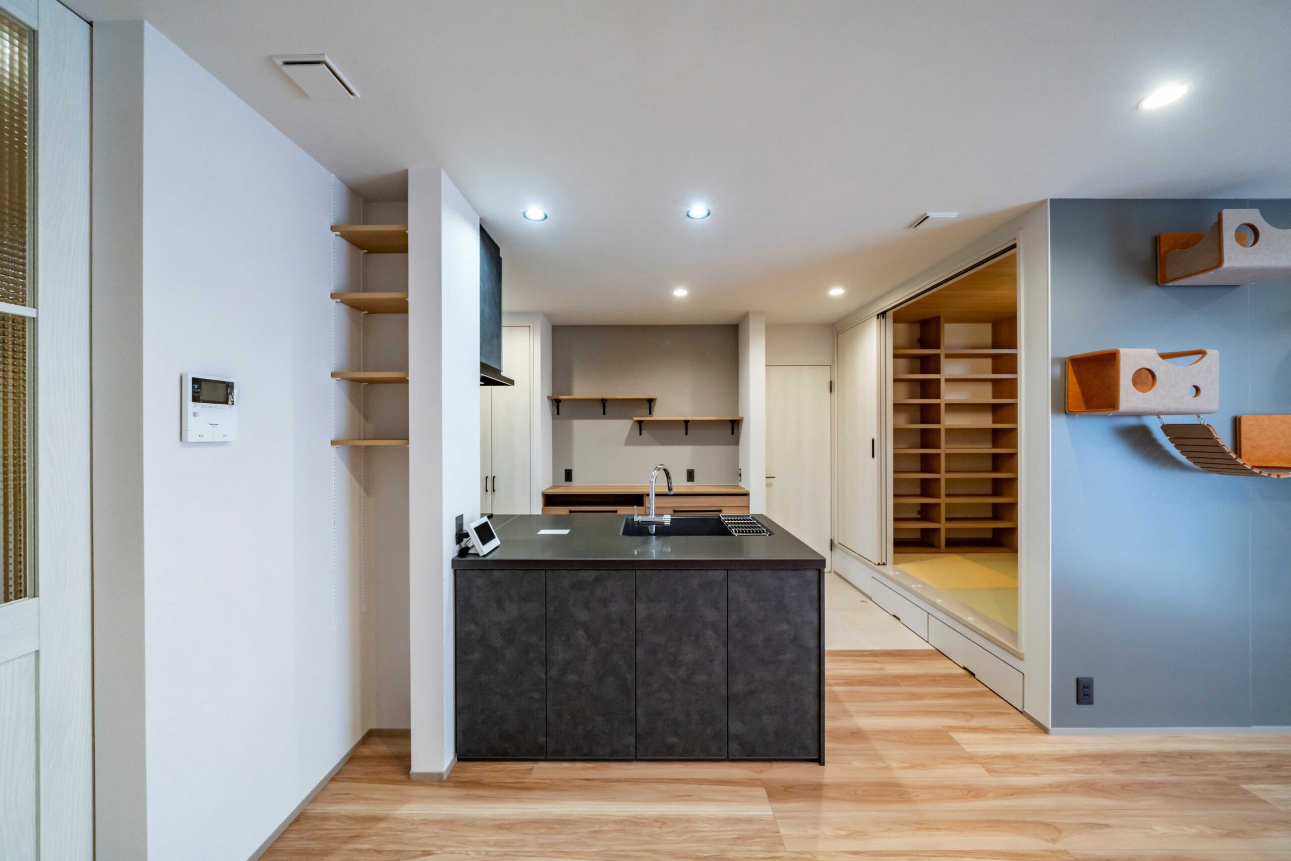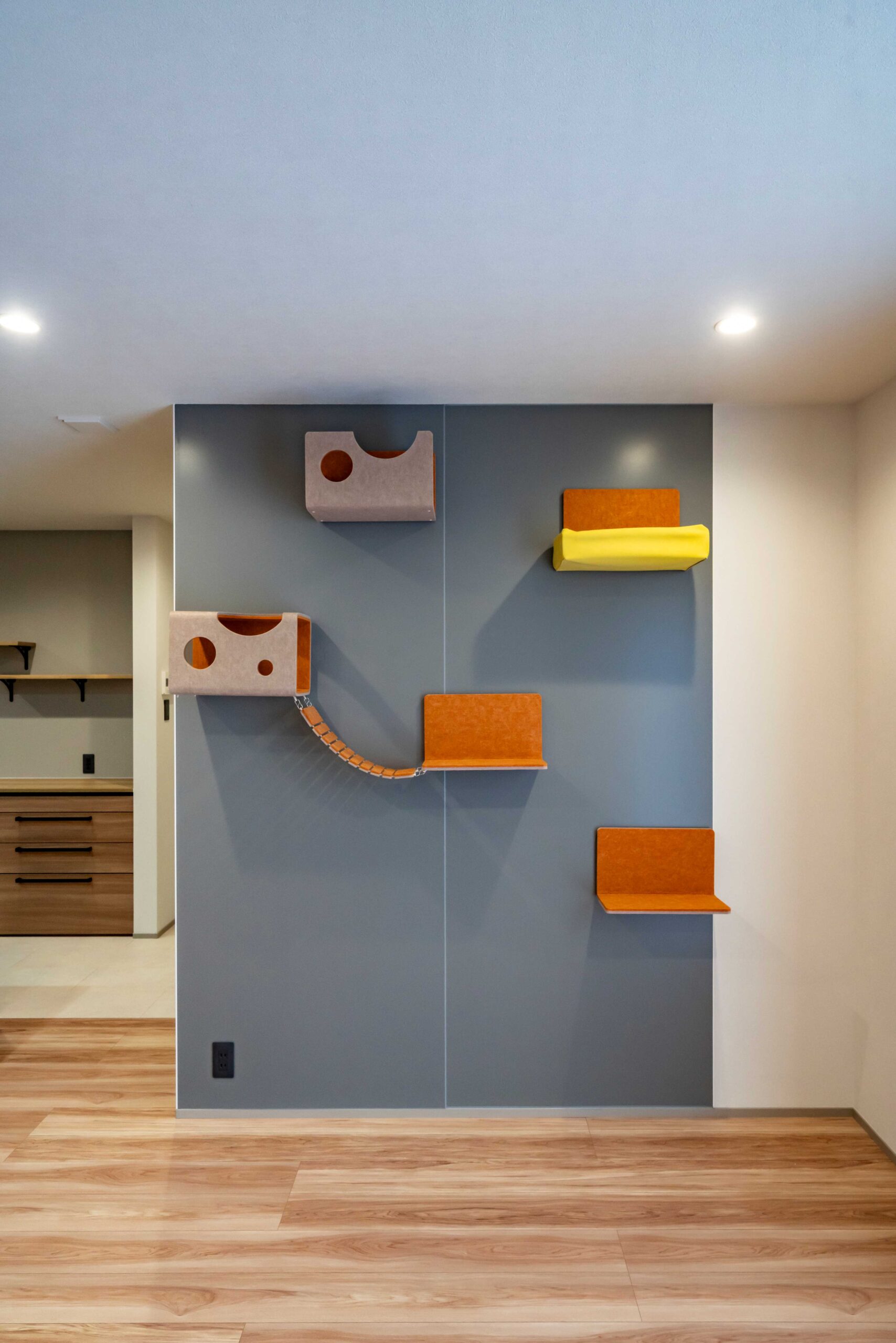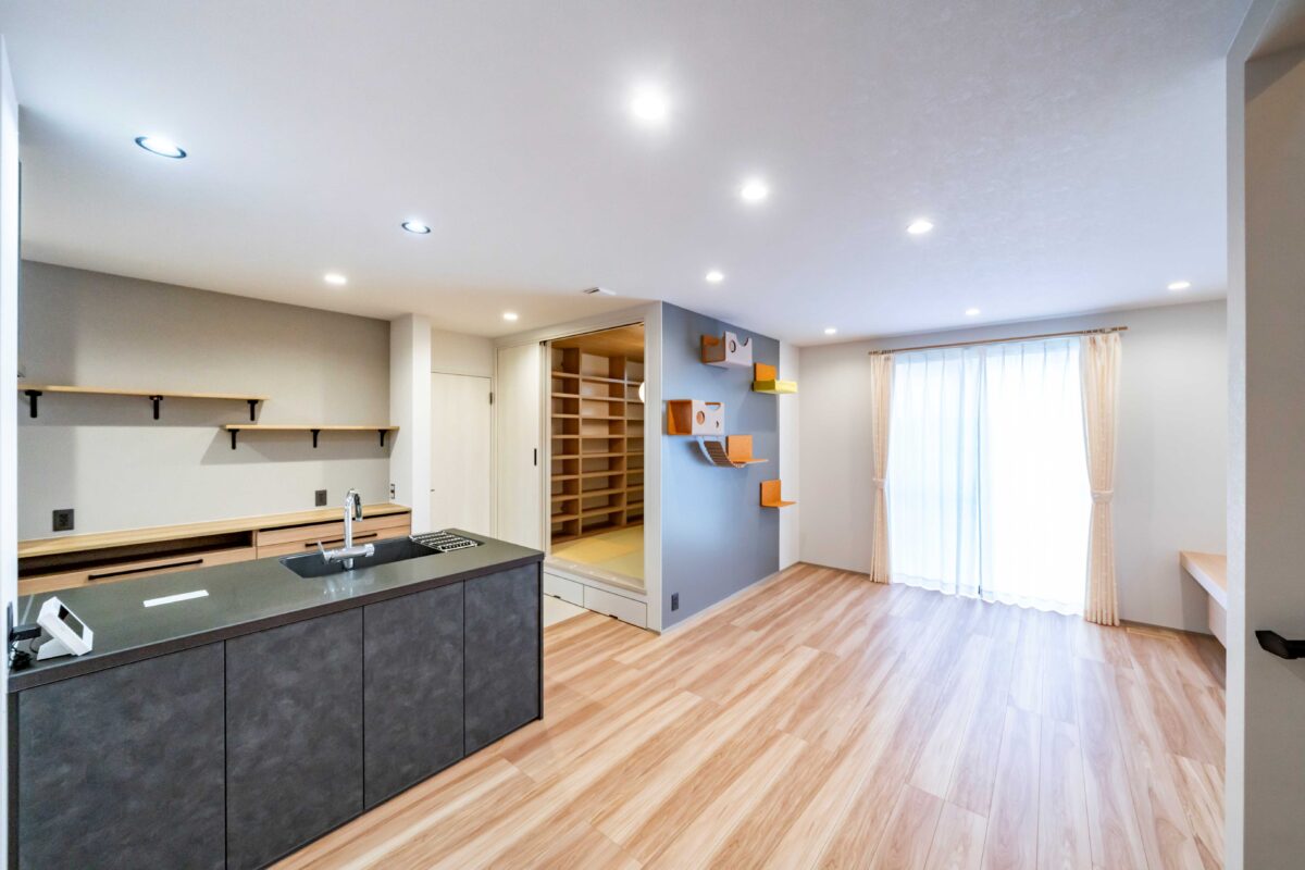 室内には、猫が自由に上下運動を楽しめるキャットウォークを設け、のびのびと過ごせる空間を確保しました。人の生活動線と自然に調和するデザインで、見た目にもすっきりと仕上げています。