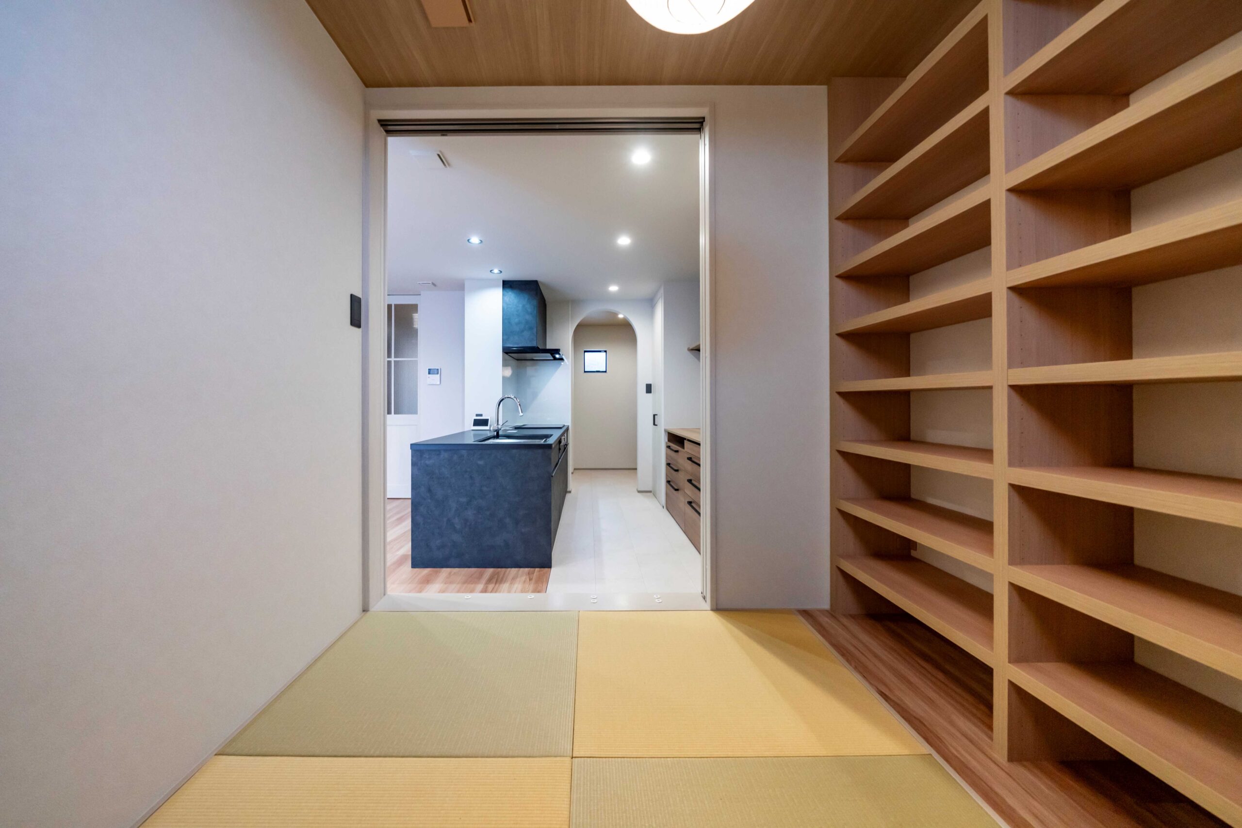 リビングの一角には、ほっと一息つけるヌック小上りの畳スペースを配置。読書をしたり、猫と一緒にくつろいだりと、日常にやさしい居場所をつくりました。