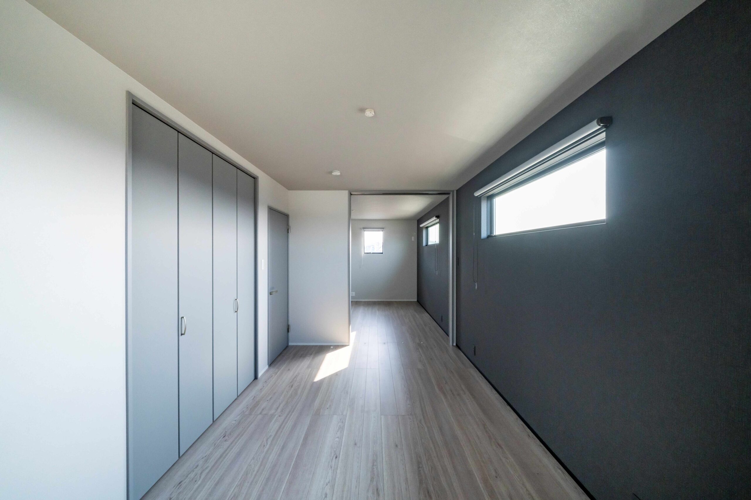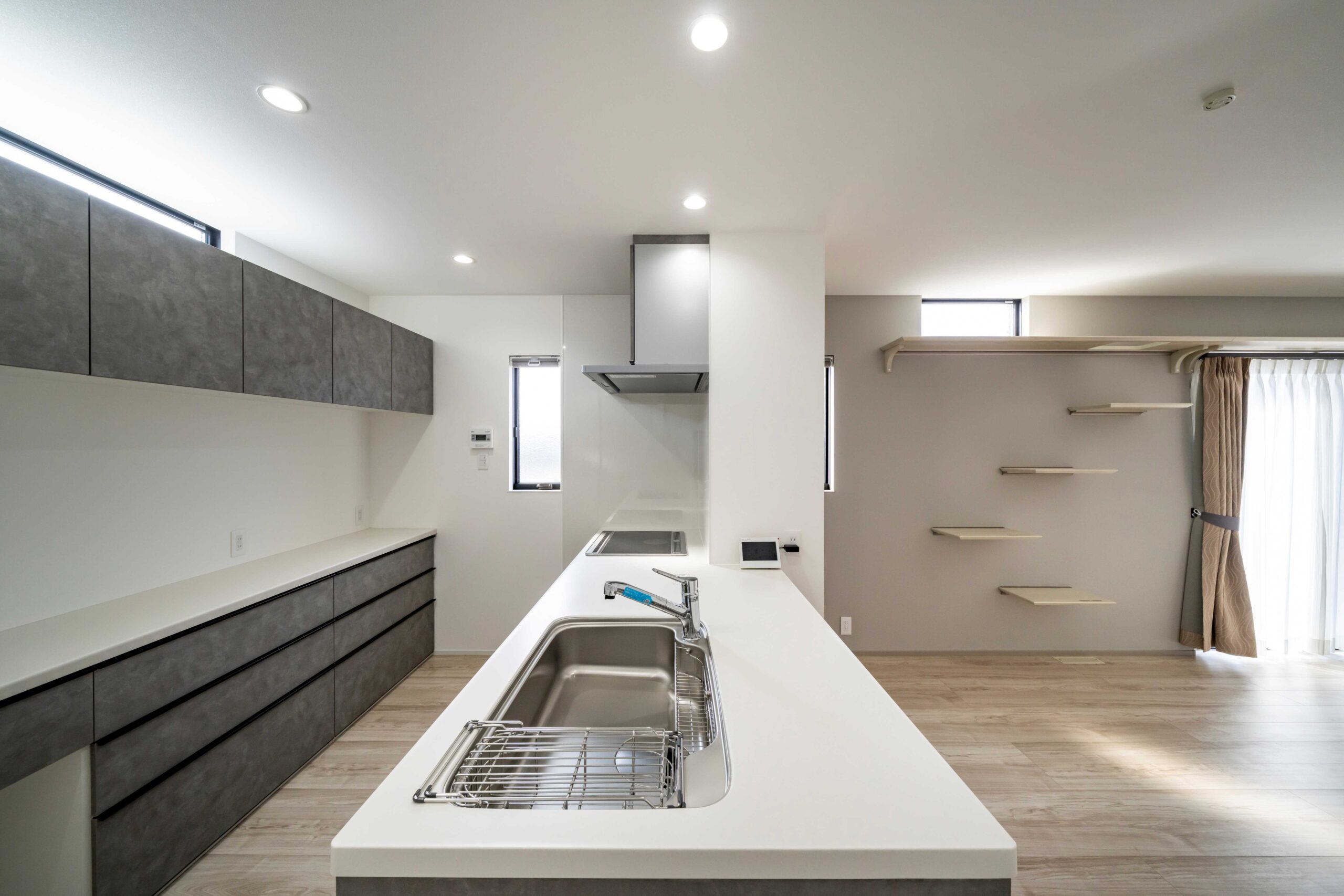 落ち着きのあるグレートーンでまとめた内装は、お施主様のお気に入りのポイントです。シンプルでありながら上質さを感じられる、飽きのこない洗練された空間に仕上がりました。